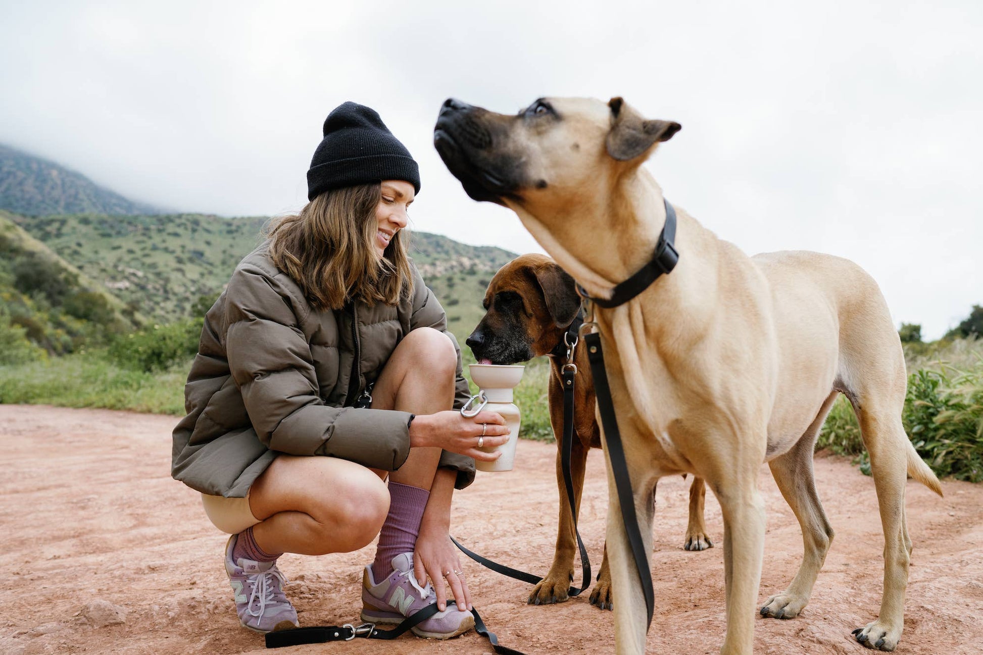 Award-Winning Springland, formerly Springer Dog Travel Water Bottle - as Seen on Shark Tank & Oprah's Favorite Things! Never worry about your dog's hydration again. Whether you're hiking mountain trails, exploring beaches, or taking road trips, keeping your dog properly hydrated shouldn't be a constant concern. The Dog Travel Water Bottle gives you instant on-the-go hydration anywhere your adventures take you. Our patented squeeze-to-drink design lets you provide fresh water with one hand - simply squeeze to fill the attached bowl, then release to automatically drain excess back inside. No mess, no waste, no worries! Over 350,000+ dog owners trust this award-winning solution for reliable hydration on every adventure. Complete with a carabiner for easy clipping to your bag or leash. 20oz Flip Dog Water Travel Bottle - Available in 6 Colors: Lilac, Sky Blue, Green, Oat, Black, Blueberry Features: One-handed hydration anywhere: Squeeze to