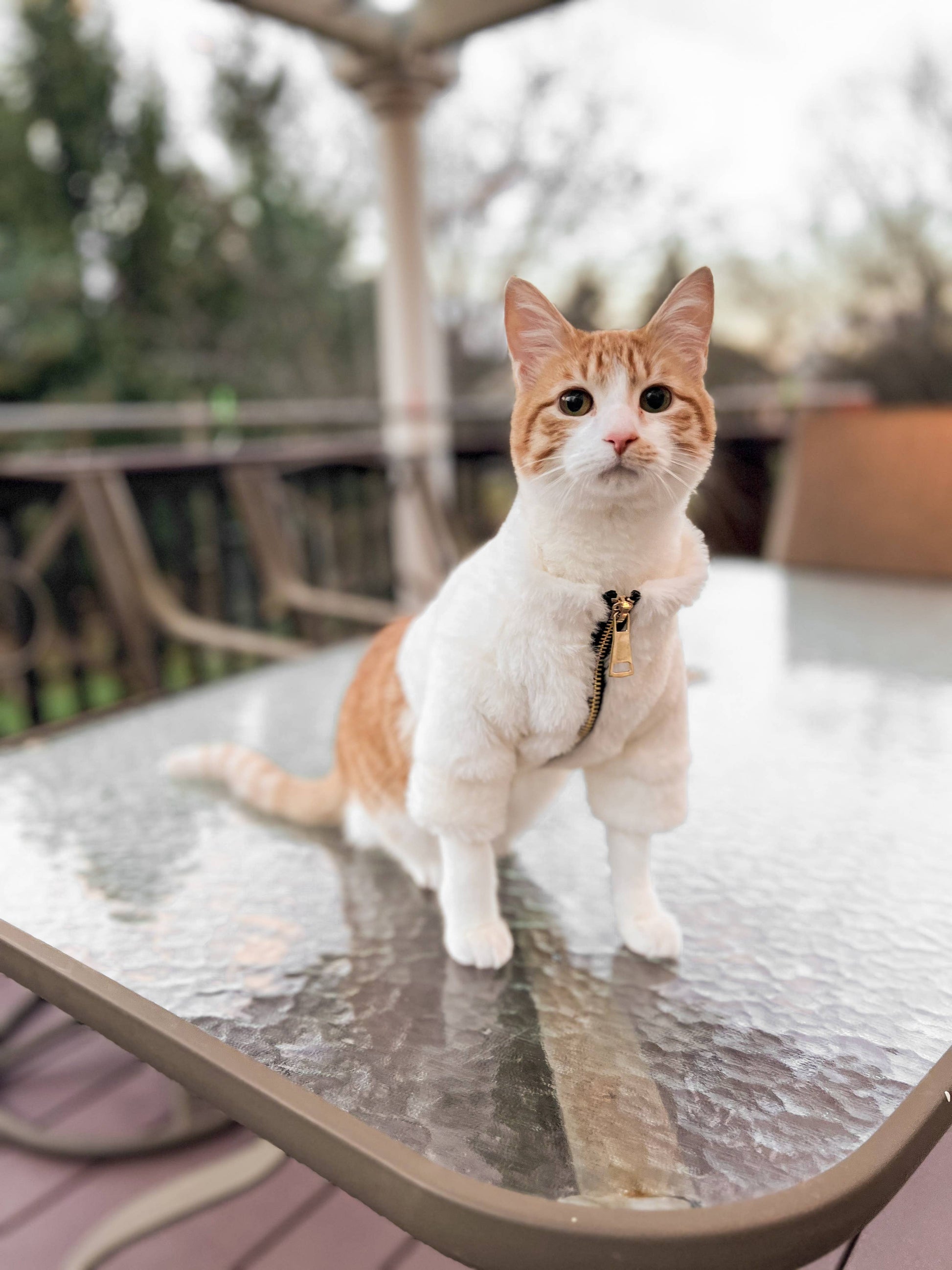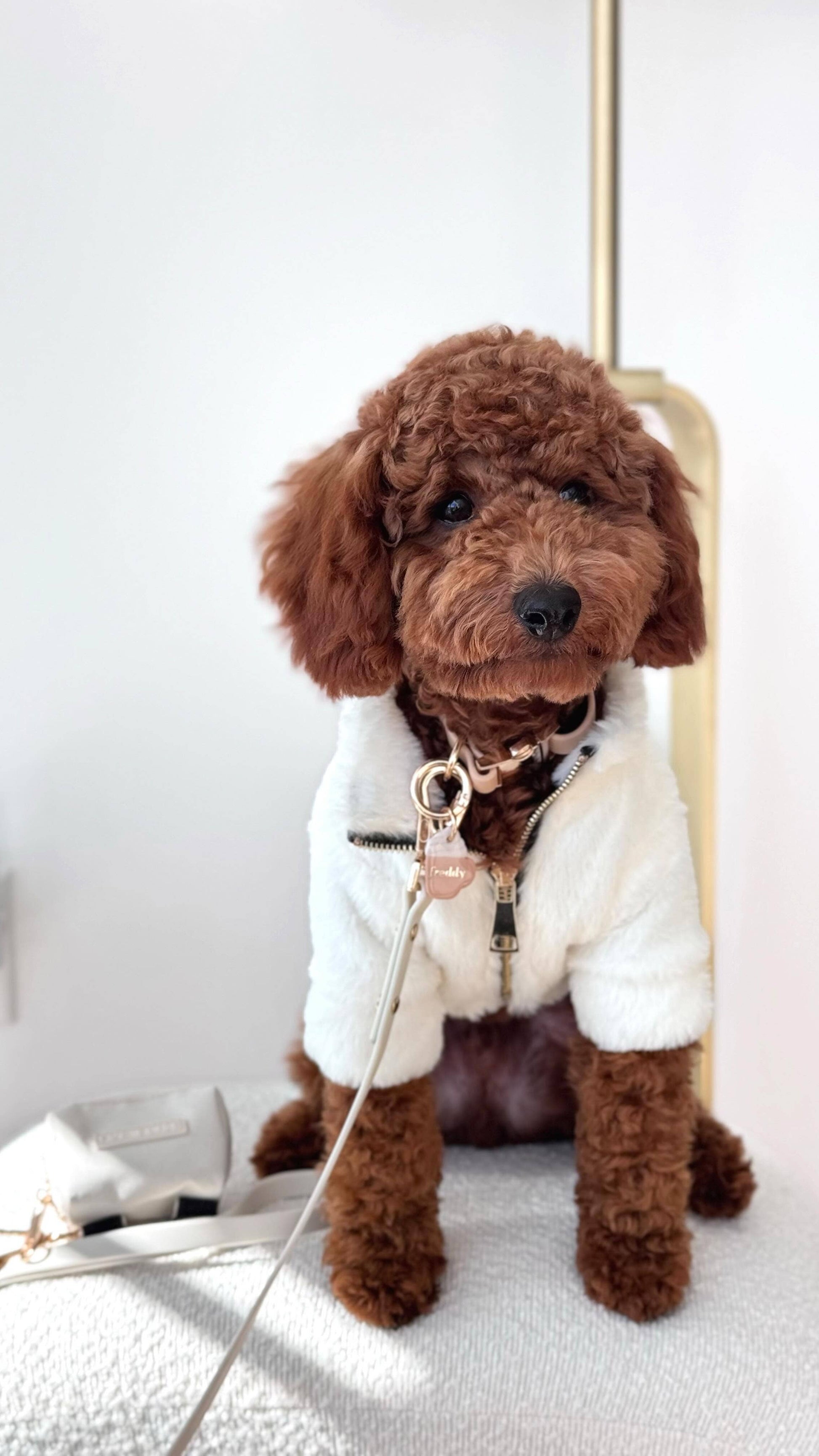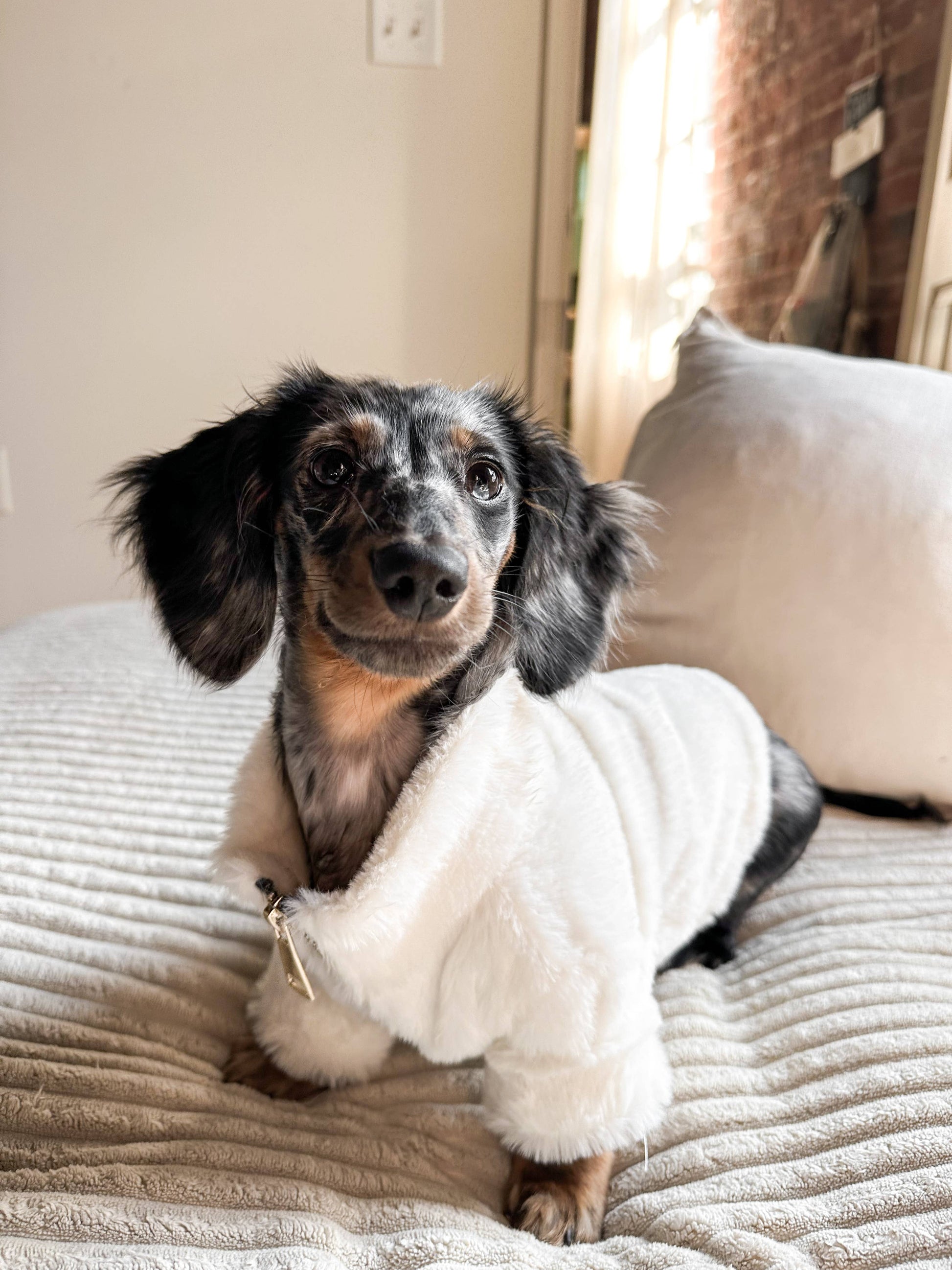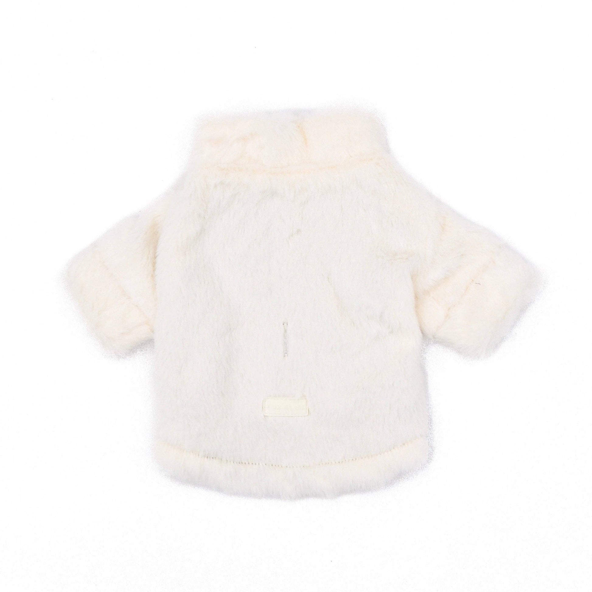 Crafted with plush faux rabbit fur, this luxurious jacket provides unparalleled softness. The gold tone zipper adds a touch of elegance, while the nylon lining ensures warmth against the winter chill. Complete with a classic rubber logo and a leash hole at the back, the Furi Pet Coat seamlessly combines fashion and functionality for your beloved pet. Keep them cozy and chic in this wardrobe staple.